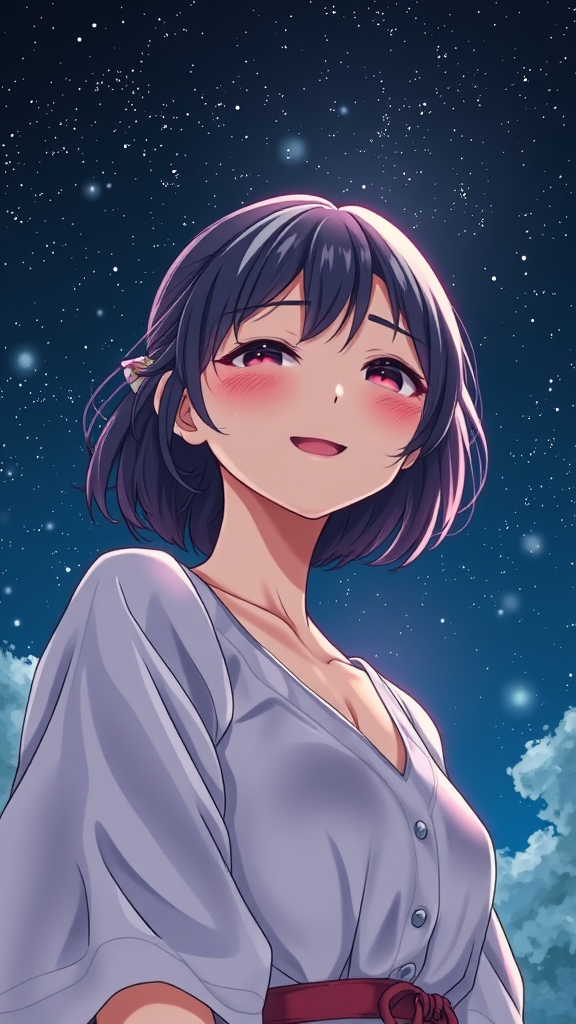 A young woman in delicate attire, inspired by the style of Oyari Ashito, set against a starlit night sky. Her expression exudes satisfaction and pure enjoyment, captured in a striking portrait that blends manga graphics and anime aesthetics. The scene plays with contrasts, utilizing dark exposure to accentuate the bright, vivid colors of her surroundings. Clouds drift subtly in the background, adding depth to the composition. The image is rendered in the highest quality with meticulous attention to detail, offering an immersive first-person perspective. The artwork balances dark tones with vibrant highlights, presented in a cinematic 9:16 aspect ratio.