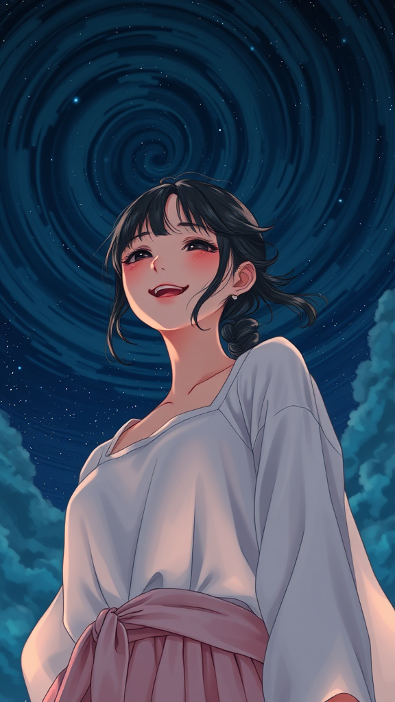 A young woman in ethereal clothing stands against a starry night sky, embodying a sense of satisfaction and joy. Her expression reflects a deep enjoyment, captured in a style reminiscent of Oyari Ashito, blending manga and anime elements. The scene is a portrait with dark exposure, contrasted by vibrant colors. The intricate details and high quality of the artwork emphasize the dark tones and swirling clouds in the background. The perspective offers a first-person view, highlighting the juxtaposition of light attire against the mystical night, creating a harmonious balance of light and shadow.