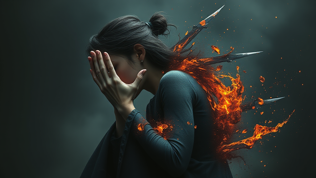 A young woman in intense anguish, grief-stricken and mourning, with hands that transform into a myriad of razor-sharp blades, her form disintegrating into molten lava, fragments of her dissolving into the earth, ethereal particles floating skyward, depicted in a full-body side perspective, shrouded in darkness, rendered in hyper-realistic detail as if through the lens of an advanced virtual engine, exquisitely haunting, --ar 9:16 --chaos 30.