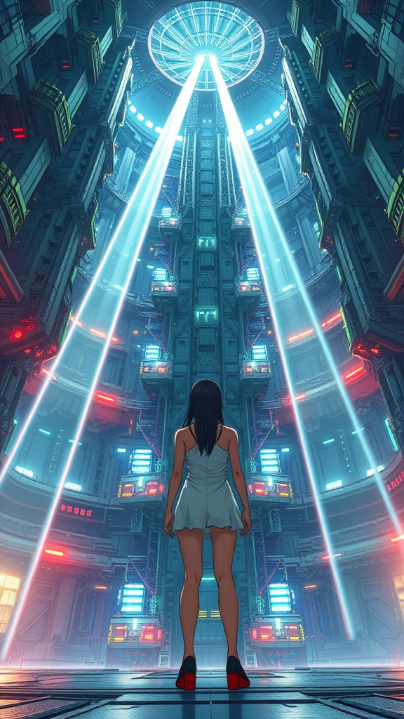 A young woman in minimal attire stands inside a vast spaceship, reminiscent of Tsutomu Nihei's art style, with echoes of "Sidonia no Kishi." Colossal structures tower around her, their complexity amplified by a hyper-detailed design. A powerful laser generator dominates the multi-level space, sending beams from the heavens above, creating a vibrant laser show. The scene is charged with clots of energy, symbolizing acceleration and light, all captured in a futuristic sci-fi ambiance. This anime-inspired scene is depicted in high-definition, super-resolution, capturing the essence of manga graphics in an 8K drawing, viewed from a first-person perspective, emphasizing speed and motion.