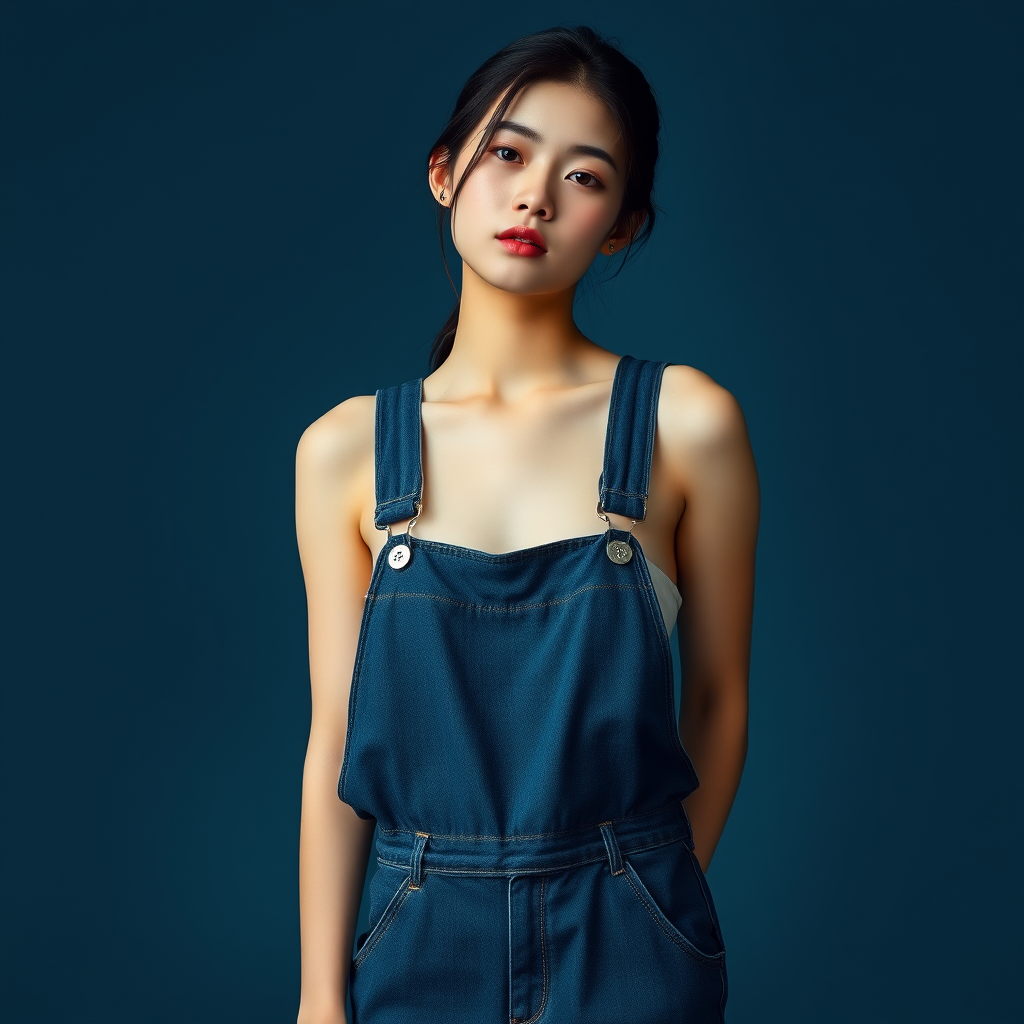 A young woman in overalls elegantly poses for the camera, exuding a serene, wavy aesthetic with dark azure tones. Her posture is relaxed and draped, capturing a minimalist beauty. The gongbi technique highlights her form with delicate precision, while the edges subtly fray, adding a touch of whimsy to the scene.