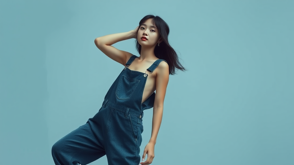 A young woman in overalls gracefully poses, captured in the essence of Shige's visual aesthetic, characterized by fluid, dark azure tones. Her posture exudes minimalist beauty, as she stands with a slight, relaxed slouch. The setting around her is subtly frayed, hinting at a gongbi influence, with every detail meticulously rendered yet intentionally understated. The overall vibe is serene and contemplative, with a touch of wistful elegance.