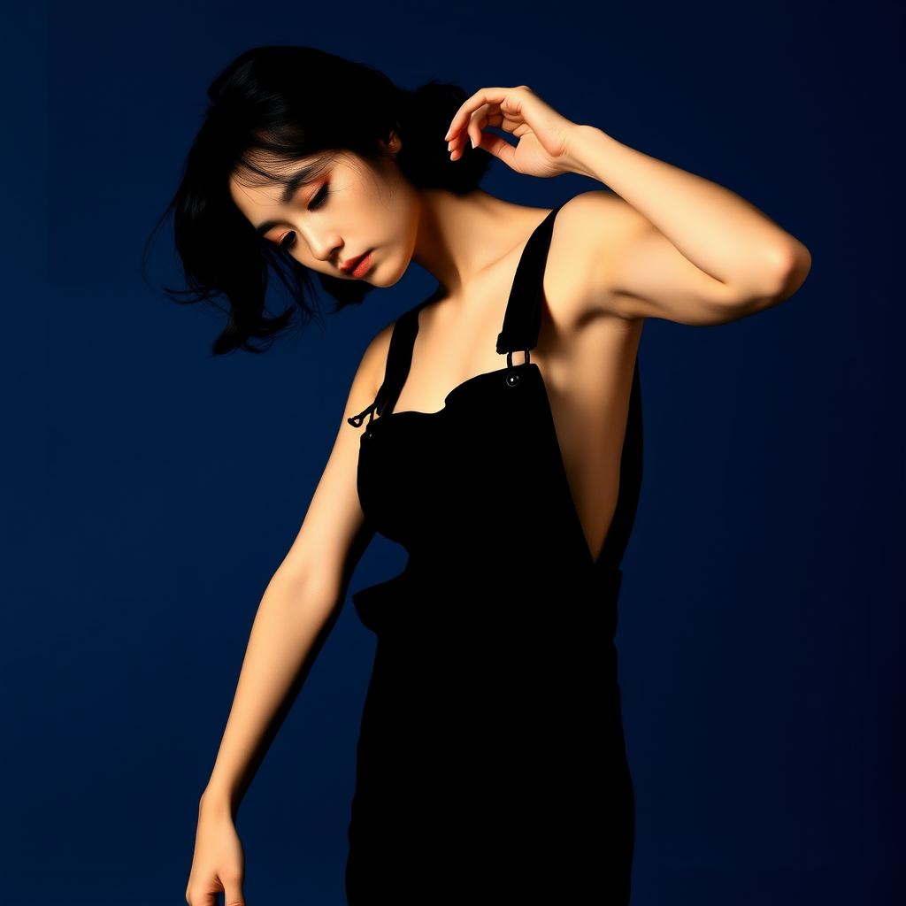 A young woman in overalls gracefully poses for the camera, her silhouette embodying the wavy, minimalist beauty typical of Shige's visual aesthetic. Her form is slumped and draped, contrasting beautifully with the deep, dark azure background. The fine lines of gongbi art trace her figure, while subtle frayed edges soften the overall composition, imbuing it with an ethereal, dreamlike quality.