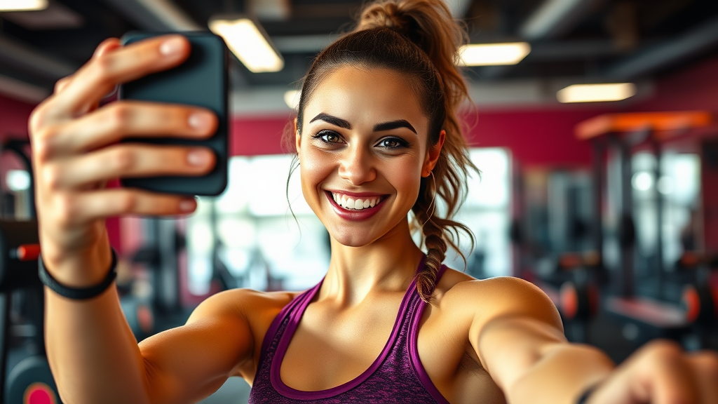 a young woman in workout attire snaps a selfie at the gym, her smile glowing with determination, surrounded by vibrant fitness equipment in the background, soft studio lighting casts a warm, inviting glow, capturing the energy and enthusiasm of a productive workout session
