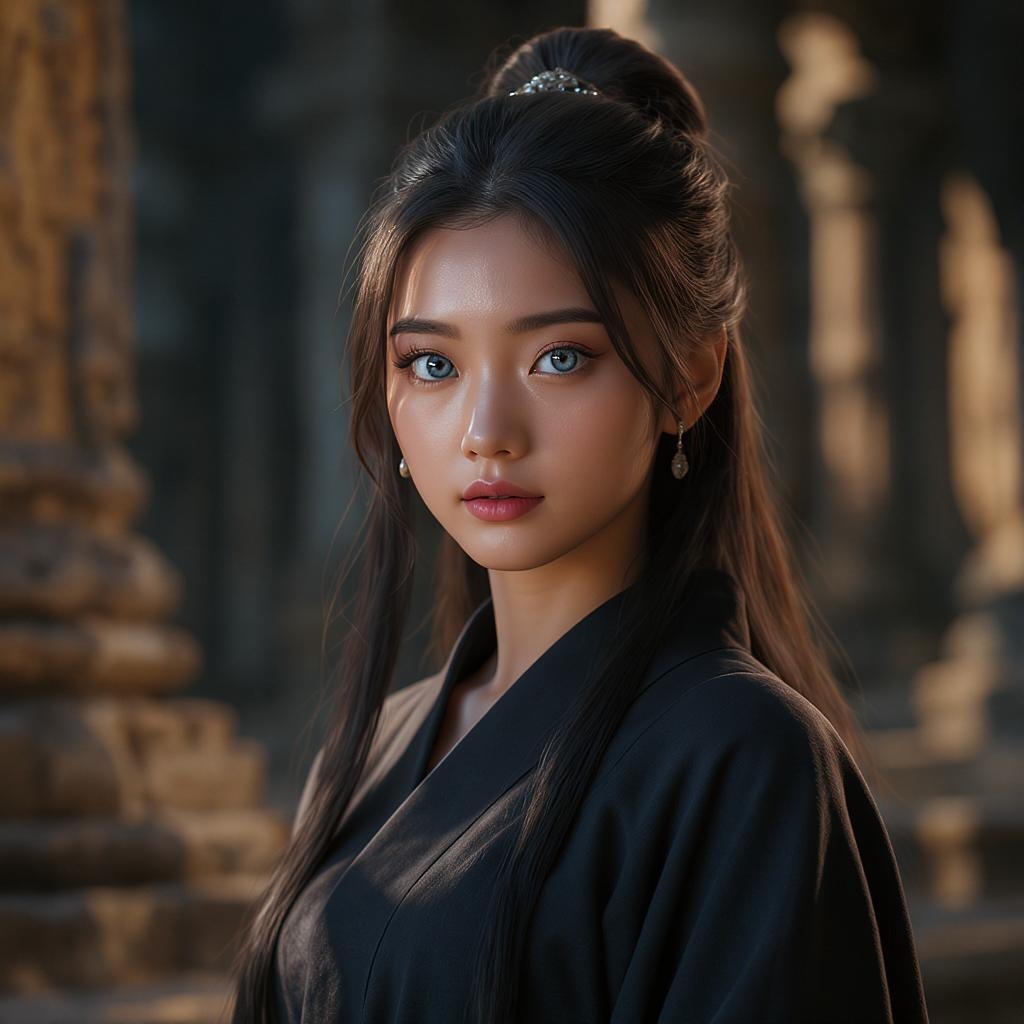 A young woman is depicted wearing dark, flowing robes set against the backdrop of an ancient temple. Her symmetrical eyes are highlighted by dramatic lighting, creating a striking and realistic image. The scene is rendered in sharp focus, HD quality, capturing the intricate details one might expect from hyperrealism and physics-based rendering. This high-detail RAW color photo possesses an ultra-high resolution akin to an 8K wallpaper, thus ensuring the image's photographic quality. The woman's elegant attire is complemented by subtle jewelry, enhancing the complexity of this CGI-inspired artwork that blends elements of photography, digital painting, and 3D illustration without veering into cartoonish or anime styles. The high level of detail avoids common pitfalls like poor anatomy, disfigurements, or awkward proportions; instead, it offers a harmonious blend of artistry and technical skill. The result is an engaging and cohesive visual, free from any errors or artifacts that might detract from its beauty.