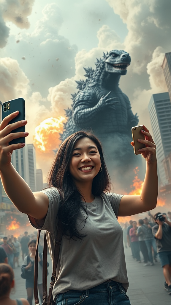 A young woman is taking a selfie with a playful smile, her smartphone held high at an angle. In the background, a colossal Godzilla is wreaking havoc on a modern cityscape, skyscrapers crumbling amidst clouds of dust and debris. Despite the chaos, bright explosions and thick smoke, the scene exudes a surreal, dream-like quality reminiscent of Studio Ghibli's storytelling and visual artistry. The panicking crowd around her adds a sense of urgency, yet she stands unfazed, capturing the moment with a sense of whimsical detachment. The photorealistic detail brings the contrast between her calm demeanor and the monstrous destruction to life, echoing Beeple's distinctive style.