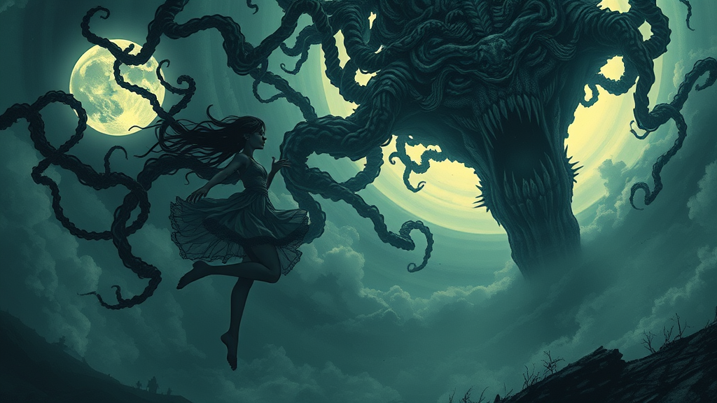 A young woman leaps gracefully through the ominous sky, her silhouette bathed in moonlight, depicted with unsettlingly intricate details reminiscent of a Junji Ito masterpiece. Tendrils of chaotic darkness weave around her, emanating from an immense, indescribable elder being looming in the backdrop, its grotesque form a nightmarish amalgamation of slithering textures and alien geometries. Her expression is a haunting mix of determination and dread, as the eerie landscape distorts around her in surreal contours, enhancing the chilling atmosphere.