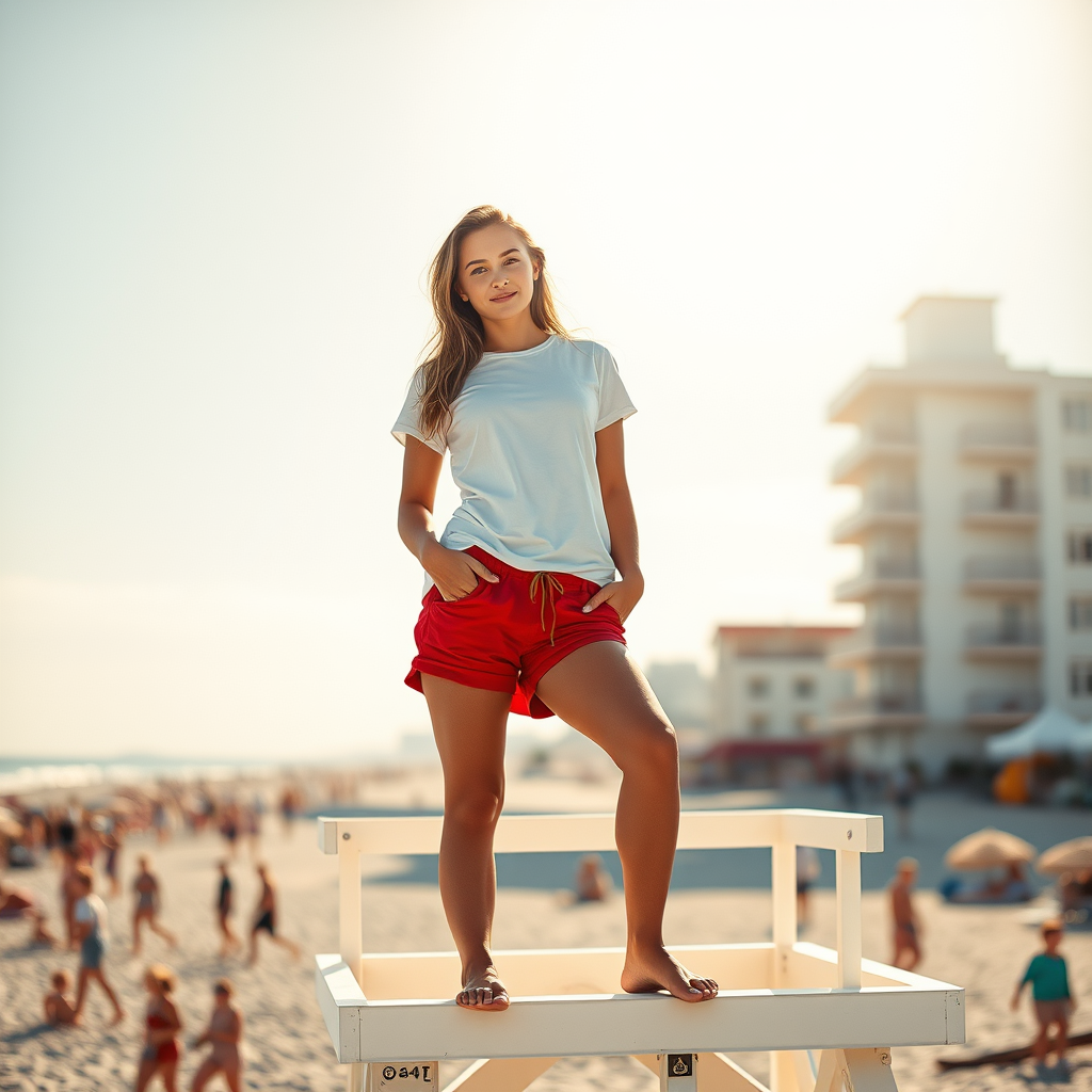 A young woman lifeguard perched confidently on a bright white lifeguard tower under the radiant sun, dressed casually in a simple white T-shirt and vibrant red shorts. She vigilantly oversees the bustling beach scene, her natural hair and eyes highlighted by the brilliant sunlight. The atmosphere is richly detailed, with an expertly balanced color palette and a gently blurred background that emphasizes her presence. The scene conveys a sense of watchfulness and serenity, with subtle creative nuances enhancing the vivid coastal setting.