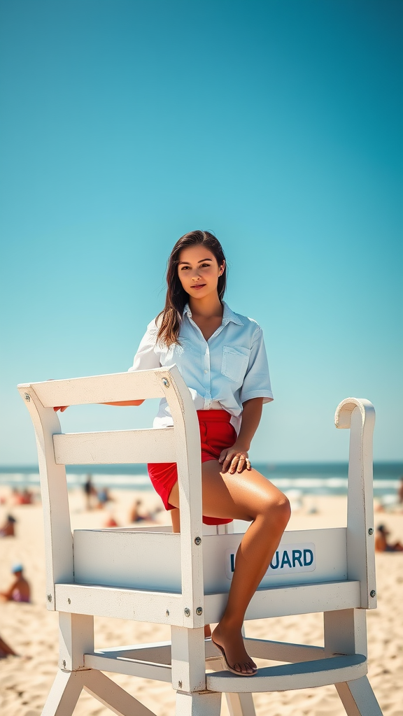 A young woman lifeguard perched on a sunlit white lifeguard tower, wearing a simple white shirt and vibrant red shorts. She's attentively overseeing the lively beach scene, her natural hair and eyes highlighted by the bright, sunny day. The scene is captured in ultra-high resolution with professional color grading, showcasing a beautiful depth of field that brings out the vividness of the seaside atmosphere, while maintaining an authentic and realistic look.
