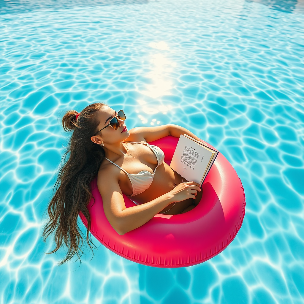 A young woman lounging on a vibrant inflatable lounger, gently bobbing on the tranquil water of a crystal-clear pool under the blazing summer sun, her sunglasses reflecting the bright sky, and a book resting on her chest as she drifts between dreams and reality, surrounded by the soft sounds of nature with the scent of blooming flowers and the distant laughter of friends.