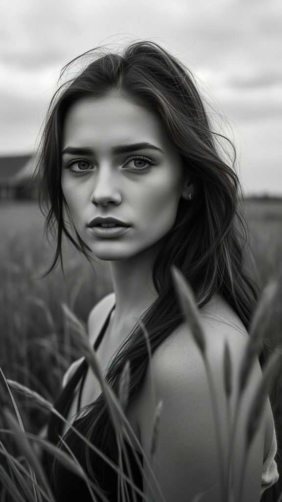 A young woman poised in a field of grass, captured in the stark contrast of black-and-white photography, reminiscent of the Hasselblad 1600f era, set against sweeping coastal landscapes. Her expressive facial features convey a depth of emotion, framed by the gentle contours of Dutch landscapes, evoking a sense of serene atmosphere. The scene blends soft, atmospheric elements with the power of a striking portrait, creating a compelling visual narrative.
