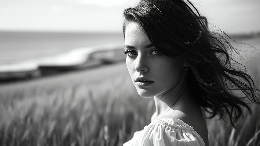 A young woman poised in a grassy field, captured in striking black-and-white photography. The scene reflects the classic detail of a Hasselblad 1600f, with sweeping coastal landscapes as her backdrop. Her expressive facial features tell a story amidst the serene yet powerful Dutch landscapes. The composition evokes soft atmospheric scenes and commanding portraiture, combining natural elegance with a sense of mystery.