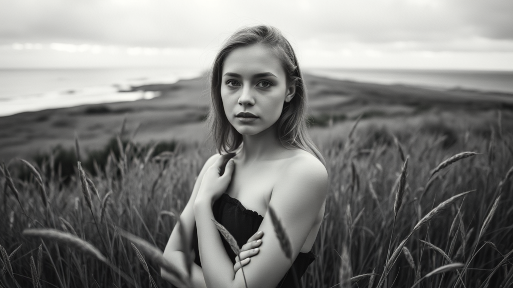 A young woman posed gracefully amidst tall grass, captured in striking black-and-white photography reminiscent of the Hasselblad 1600f. She stands against the backdrop of sweeping coastal and Dutch landscapes, her expressive facial features conveying depth and emotion. The scene is enveloped in a soft, atmospheric ambiance, creating a powerful portrait that echoes the beauty and serenity of the natural world.