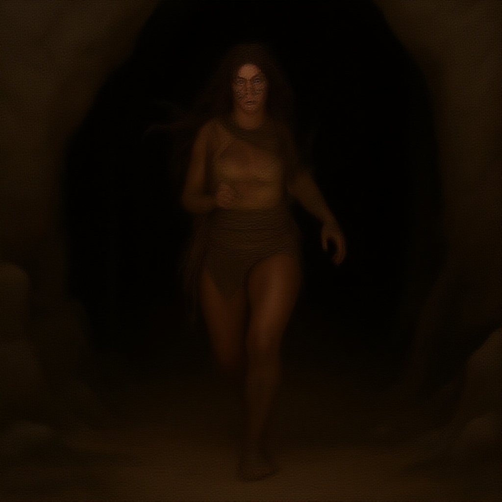 A young woman reminiscent of Elle Fanning emerges in a prehistoric setting, standing alone in a rugged stone age landscape. Her attire is a primitive loin cloth, and her wild, untamed hair cascades down her back. Intricate tribal tattoos adorn her skin, hinting at her connection to an ancient tribe. Clutching a spear with determination, she stands at the entrance of a dimly lit cave, her expression a mix of fear and resolve. The scene is crafted in ultra-realistic detail, as if rendered in 8k using an advanced engine, capturing every nuance of her surroundings. The style echoes the legendary work of Boris Vallejo and Frank Frazetta, with dramatic lighting and intense atmosphere, creating a vivid portrait of primal life.