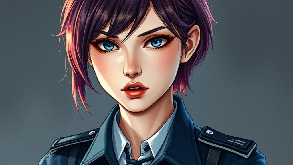 A young woman reminiscent of Jill Valentine from Resident Evil 3, wearing a detailed police uniform, featuring beautifully intricate, vividly colored hair. An anime portrait with hard shadows and strong rim lighting, resembling a watercolor painting using traditional materials. Inspired by the artistic styles of Juan Giminez, Atey Ghailan, and Sachin Teng. Medium shot with slight creative distortions in her eyes and lips, adding unique character to her appearance.