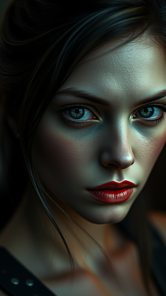 A young woman reminiscent of Jill Valentine from Resident Evil 3 remake, captured in a redshift style. Her face is perfect and elegant, featuring intricate and highly detailed features. The portrait is trending on ArtStation and evokes the artistic essence of Tom Bagshaw and Seb McKinnon, depicted in a 150mm format. The scene is a blend of photography and epic cinematic style, akin to an octane render. It is thoughtfully denoised to achieve a pristine look, as if taken with a Hasselblad H3DII camera. Despite the artistic precision, there are elements of exaggeration with a slightly distorted, cartoonish style, incorporating imperfections like an extremely detailed but warped face and peculiar eye features, adding a creative CGI twist to the composition.