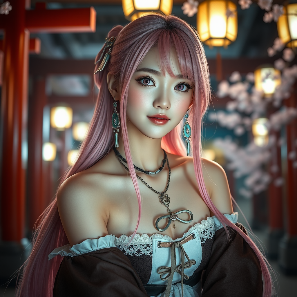 A young woman, resembling a K-pop idol, with an upper body focus, is inspired by the character Yae Miko. She wears a unique outfit with detached sleeves and bare shoulders, her long pink hair cascading down. Her clothing is slightly open and of the highest quality, adorned with intricate jewelry and earrings. Her captivating purple eyes are framed by a detailed face, highlighted under the lantern light amidst a setting with torii gates and cherry blossoms. The scene has a rich depth of field with her face in focus. She dons a nontraditional miko outfit with ribbon trim and shiny skin, exuding a soft smile. The setting features elements of East Asian architecture, and she is seated, her long sleeves draping gracefully.