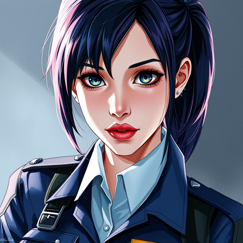 A young woman resembling Jill Valentine from Resident Evil 3, dressed in a detailed police uniform, with beautiful and intricately colored hair. An anime portrait capturing strong, hard shadows and a striking rim light, crafted using watercolor techniques. The art style evokes the works of Juan Gimenez, Atey Ghailan, and Sachin Teng. The medium shot features slight creative distortions - with an intentionally deformed perspective, subtly asymmetrical eyes, and uniquely shaped lips.