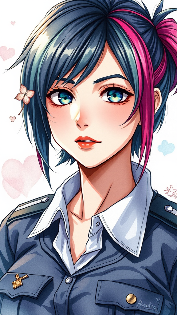 A young woman resembling Jill Valentine from Resident Evil 3, dressed in a detailed police uniform, showcasing beautifully intricate and colorful hair. This anime portrait highlights her with hard shadows and a strong rim light, embodying the essence of watercolor art style. The piece draws inspiration from the works of Juan Giminez, Atey Ghailan, and Sachin Teng. Despite being a medium shot, the focus on expression is emphasized by subtly distorted features like an asymmetrical eye and uniquely shaped lips, adding a captivating uniqueness to her appearance.