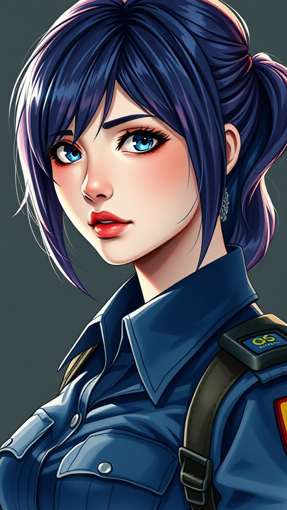 A young woman resembling Jill Valentine from Resident Evil 3, dressed in a detailed police uniform, her beautiful and intricately colored hair catching the light. The anime-style portrait showcases her with hard shadows and strong rim light, reminiscent of watercolour techniques. The artwork, inspired by Juan Gimenez, Atey Ghailan, and Sachin Teng, offers a traditional artistic approach. The portrait is a medium shot, subtly surreal with unique features like a slightly distorted eye and lips, adding an intriguing and creative twist to her appearance.