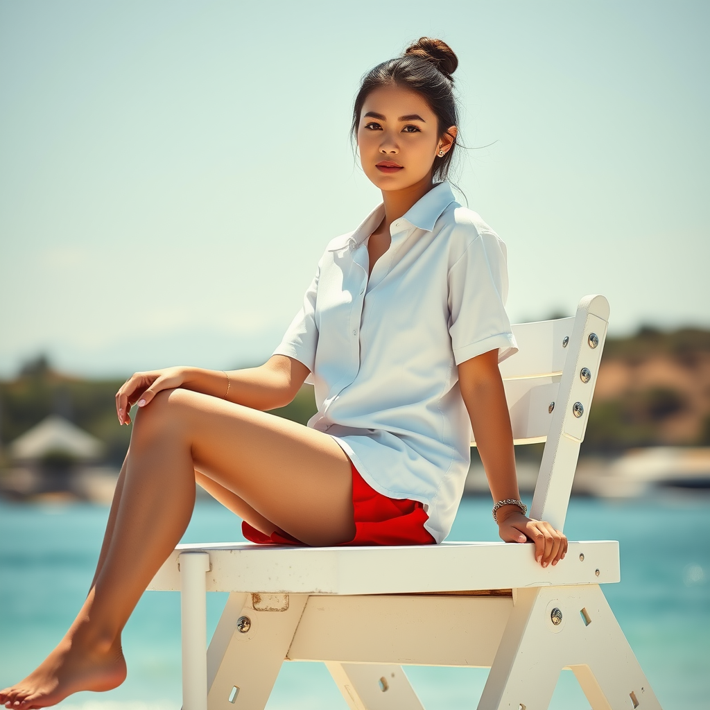 A young woman serving as a lifeguard sits in the sunshine atop a sturdy white lifeguard tower, wearing a simple, bright white shirt paired with vibrant red shorts. The scene is captured in stunning 8k resolution, with professional color grading enhancing the natural hues. The depth of field is expertly managed, subtly bringing attention to her understated jewelry. The composition is thoughtfully articulated, with an emphasis on maintaining realism and detail, while minor artistic liberties enhance the overall mood and focus of the imagery.