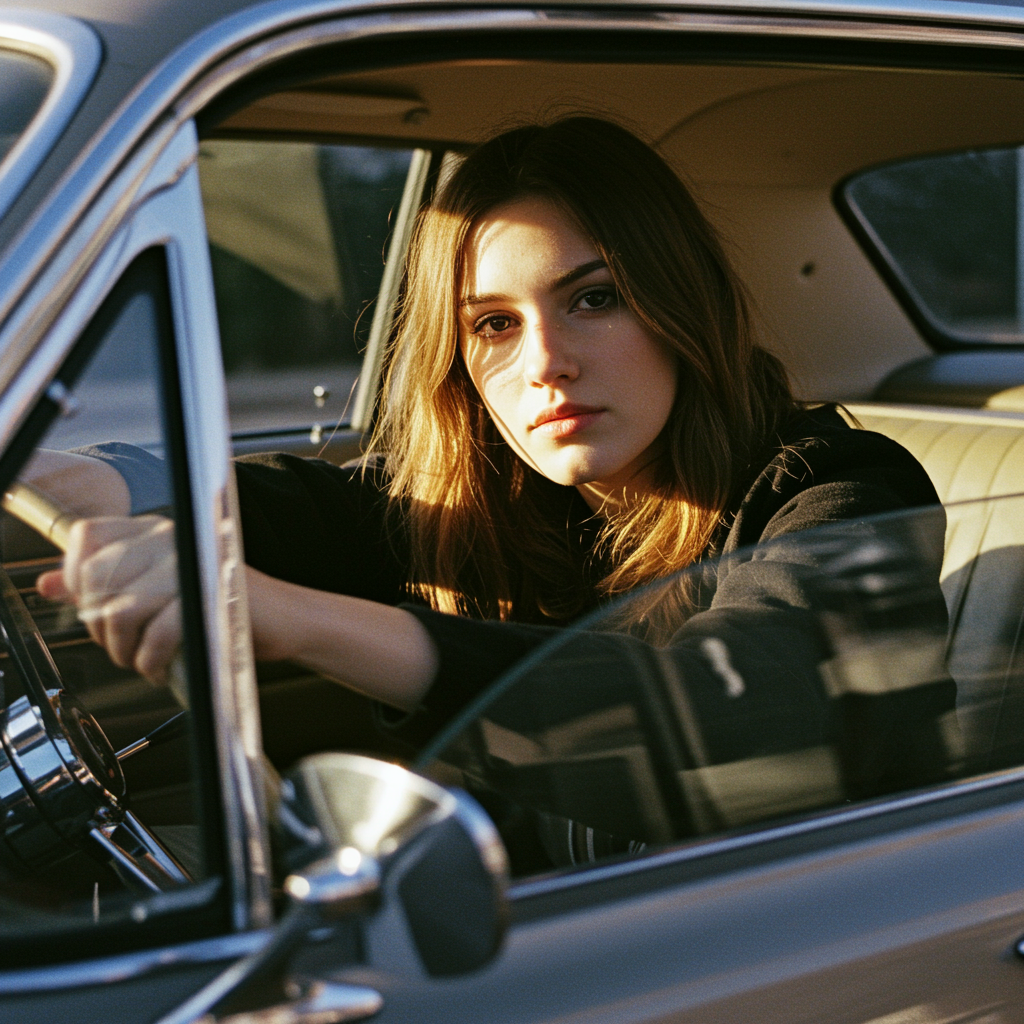 A young woman sits behind the wheel of a vintage car, her expression a mix of defiance and vulnerability. Sunlight filters through the windshield, casting intricate patterns on her face. Her hand grips the steering wheel tightly, while the other rests casually on the window ledge. The retro interior surrounds her, with soft leather seats and chrome details. Her eyes, deep and thoughtful, gaze forward, lost in contemplation. Strands of her hair catch the light, creating a halo effect as she sits in this intimate, confined space, symbolizing both escape and entrapment.