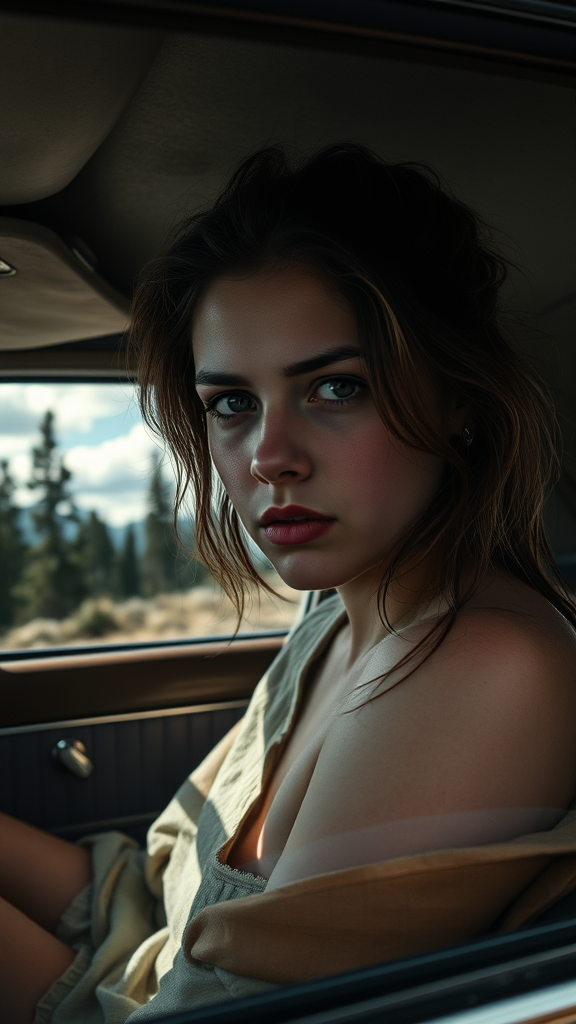 A young woman sits in the driver's seat of a vintage car, her expression intense and a hint of desperation in her eyes. Sunlight filters through the windshield, casting dramatic shadows across her face. Her hair is slightly disheveled, capturing a moment of chaotic beauty. The car's interior is a mix of classic detailing and worn textures, reflecting a mood of nostalgic tension. Outside, a hauntingly serene landscape of towering pine trees and distant mountains stretches under a cloudy sky, adding a sense of mystery and suspense to the scene.