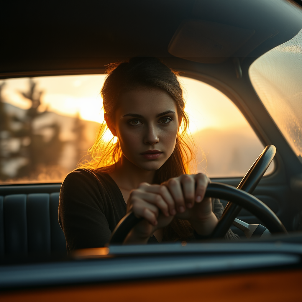 A young woman sits in the front seat of a vintage car, her expression a mix of determination and vulnerability. The setting sun casts warm hues across the dashboard, illuminating her face. Her hands grip the steering wheel tightly, while her gaze is fixed straight ahead, reflecting both determination and a hint of despair. The car's windows are slightly fogged, adding an ethereal quality to the scene as shadows play across her features. Outside, towering pines and misty mountains hint at an enigmatic environment, enhancing the sense of mystery and emotion in the moment.