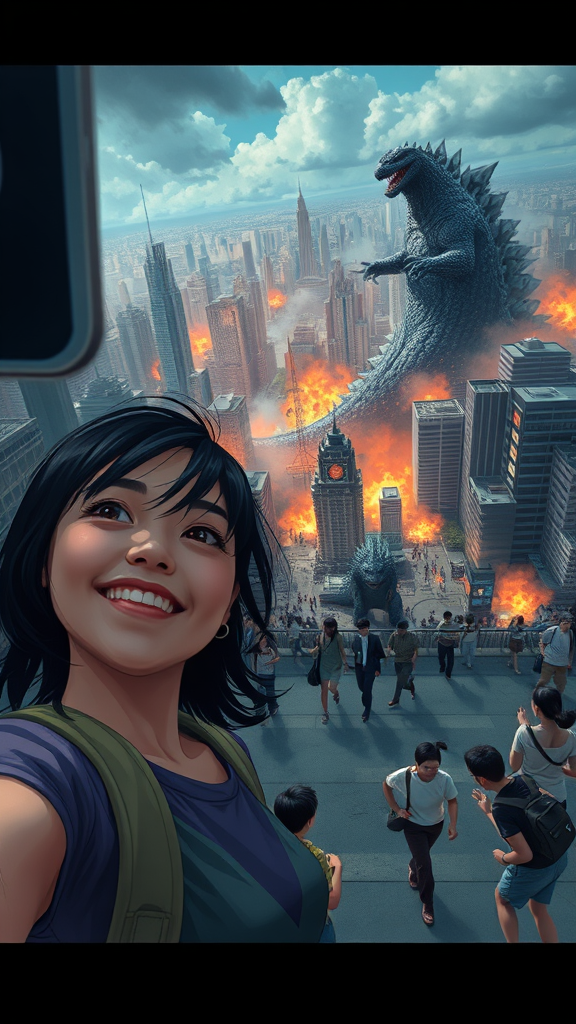 A young woman snapping a selfie with an expression of excitement, as behind her Godzilla wreaks havoc on a sprawling cityscape. Around her, people are in chaos, some running for safety while others stand frozen in disbelief. The scene captures a surreal blend of hyper-realistic detail and the whimsical charm reminiscent of Studio Ghibli's storytelling, with a vivid palette and dynamic composition that brings the nightmare scenario to life, creating a juxtaposition of modern technology and mythical destruction.