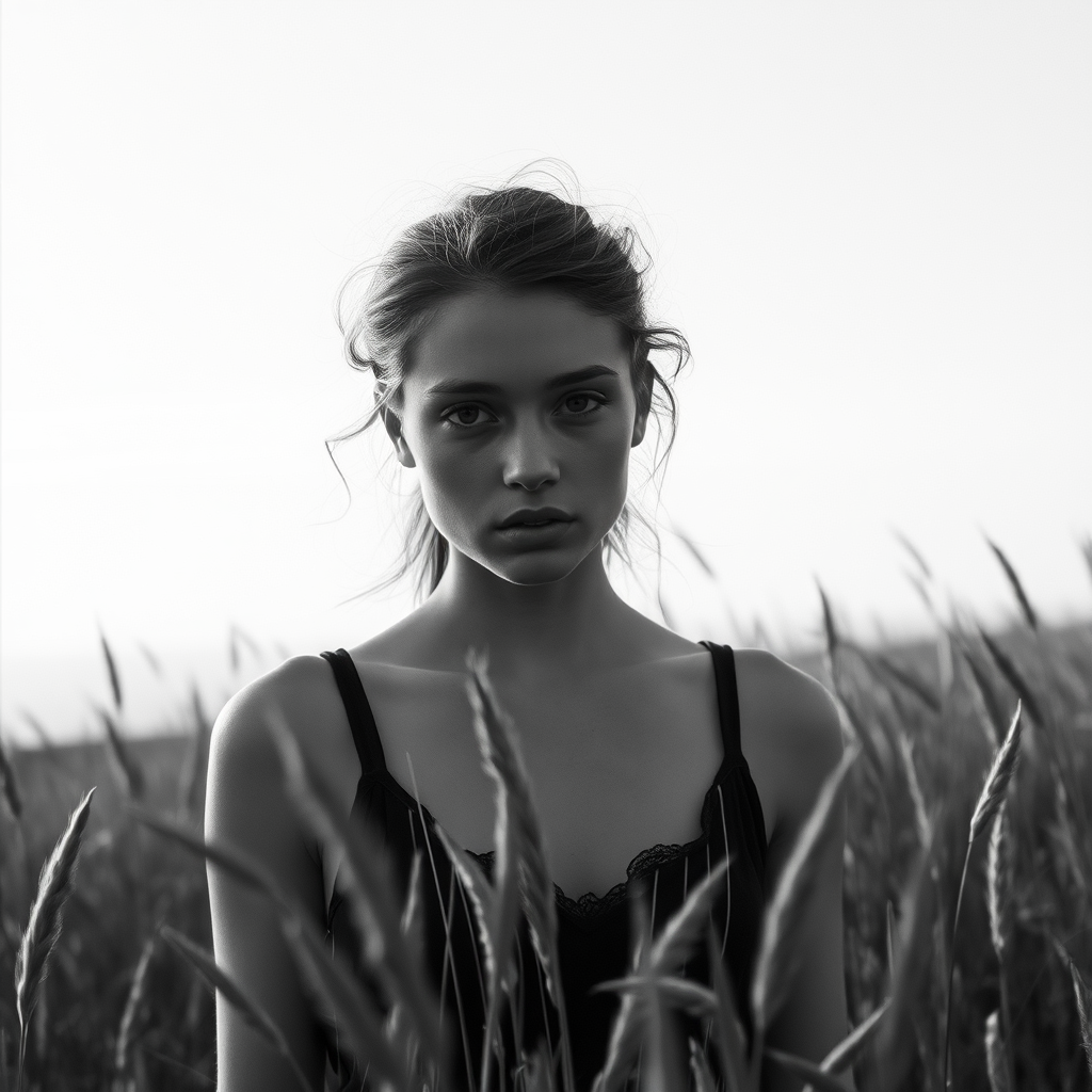 A young woman standing amid tall grass, captured in stark black-and-white photography, evoking the timeless elegance of a Hasselblad 1600f. The scene unfolds with expansive coastal landscapes merging seamlessly with the serene beauty of Dutch fields. The focus is on her expressive facial features, which convey a subtle yet powerful narrative. The atmosphere is soft yet dynamic, creating an ethereal backdrop for this compelling portrait, where the blend of natural elements and human emotion creates a striking visual symphony.
