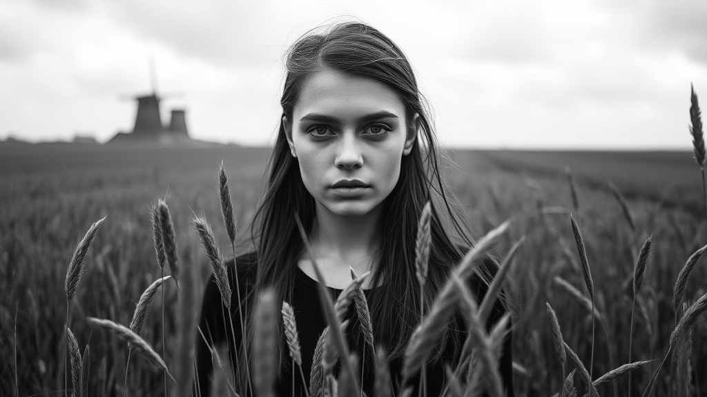 A young woman standing amidst tall grass, captured in stark black-and-white photography. The setting blends the rugged beauty of coastal landscapes with the serene expanse of Dutch fields. Her expressive facial features convey a strong emotional presence, set against the soft, atmospheric backdrop of an overcast sky. The photograph exudes the clarity and detail typical of a Hasselblad 1600f camera, emphasizing powerful portraiture with nuanced contrasts, while the elongated vertical aspect ratio adds elegance to the scene.