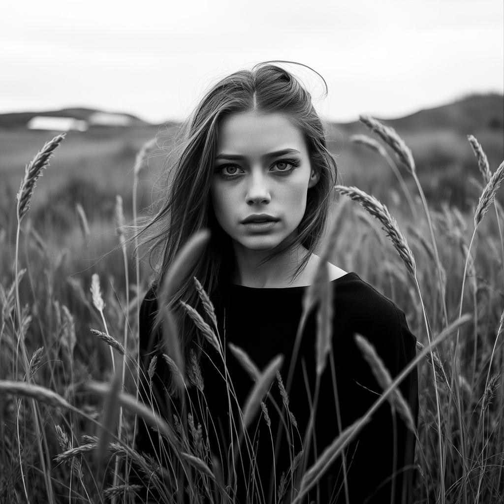 A young woman standing amidst wild grasses, captured in stark black-and-white photography. The scene evokes the classic Hasselblad 1600f feel, with sweeping coastal landscapes framing her presence. Her expressive facial features tell a story of introspection and resilience. The backdrop hints at Dutch landscapes, with rolling dunes and soft atmospheric elements adding depth. The portrait is powerful and evocative, blending the softness of the scene with the strength of her gaze, creating a mesmerizing image that resonates with timeless elegance.