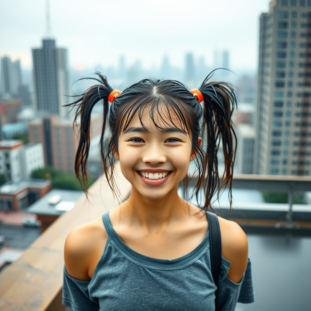 A young woman standing on a rainy rooftop, full of life and joy, with wet hair tied into playful ponytails, smiling as raindrops dance around her. The scene captures her youthful exuberance and the refreshing feel of the rain. The landscape is vibrant and the setting creates an atmosphere of freedom and happiness. Background hints at a bustling city skyline, softened by a gentle rain mist. The focus remains on her radiant complexion and bright eyes, accentuated by the shimmering wetness of her hair. The image carries a sense of adventure and spontaneous delight, reflecting a moment of pure joy in an urban jungle.