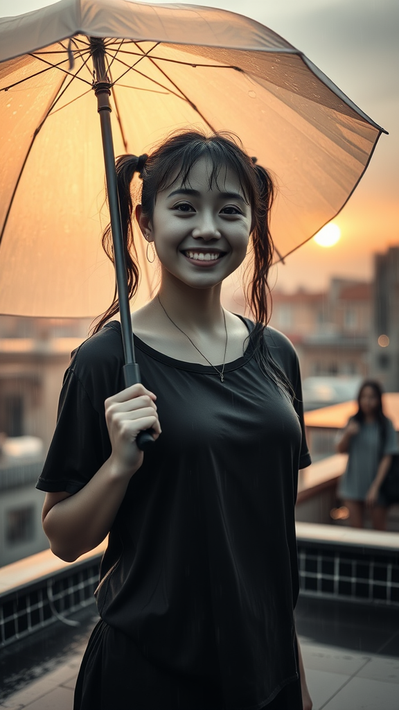 A young woman standing on a rooftop in the rain, her wet hair pulled back into ponytails. She's smiling brightly, embodying a sense of joy and freedom. The scene is set during the dramatic golden hour, casting a cinematic glow across a complex, detailed background. Her clothes are soaking wet, emphasizing the moment's authenticity, as she holds an umbrella that adds a touch of whimsy to the scene. The image is highly detailed, capturing the essence of the filmic atmosphere. Despite the monochrome (black and white) setting, the composition retains a richness that speaks volumes. The focus is sharp on her expression, yet there's a subtle blur in the background that enhances the depth of the scene, evoking a dream-like quality. The picture avoids any signs of disfigurement or unnatural features, showcasing her natural beauty and grace without alteration. Her proportions are realistic and anatomically accurate, with no distortion or extra limbs. The artistic rendering captures her essence in a way that's engaging and visually appealing, steering clear of overly stylized or exaggerated elements.