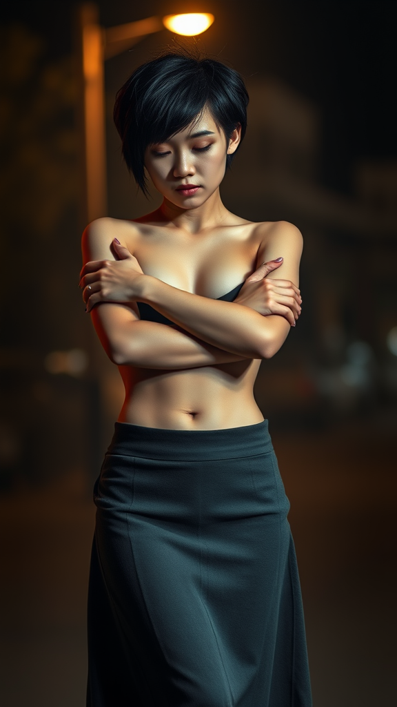 A young woman standing with arms crossed, wearing a contemplative expression and gazing downwards in the serene nighttime atmosphere. She has a slender figure with defined abs and rib outlines, and is dressed in an elegant A-line skirt and minimalistic crop top. Her striking black hair is short and artfully unkempt, adding to her captivating presence. The scene captures an ultra-realistic aesthetic with intricate details, featuring sharp focus and a shallow depth of field akin to an f/1.8 shot using an 85mm lens, depicted in a medium shot. The ambiance is enhanced by soft, diffused volumetric fog, creating a serene yet dramatic effect. The visual composition is further enriched with HDR quality, emphasizing a hyper-realistic texture in 4k and 8k resolution, highlighting her features. The overall image is refined and polished, free from any visual distractions, irregularities, or distortions, ensuring an engaging and immersive experience.