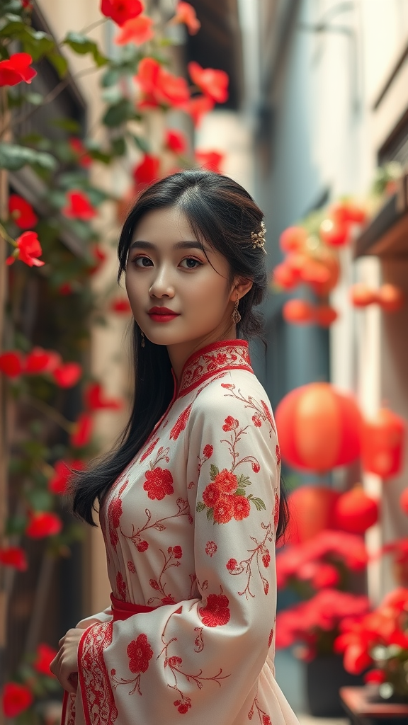 A young woman stands gracefully in a narrow street adorned with vibrant red flowers, her presence evoking the essence of Chinese cultural elegance. The romantic and nostalgic ambiance is captured with the soft focus and shallow depth of field of a 50mm f/1.4 lens. The scene is bathed in light white and gentle amber hues, enhancing the dreamlike quality of the moment. Her attire, an exquisite display of intricate embroidery, adds to the air of elegance. The atmosphere is both delicate and ethereal, as if viewed through a translucent veil, capturing a timeless and serene moment.