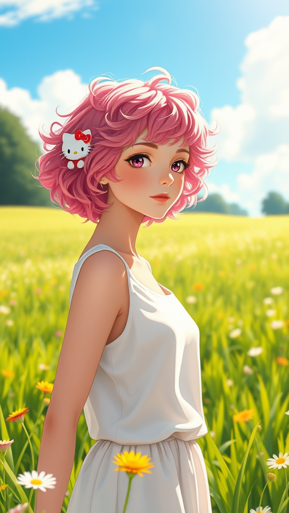 A young woman stands gracefully in a sun-kissed meadow, her pink and blonde curly hair catching the light in vibrant waves. Her hair, cut at a jaunty short length, bounces gently with each movement. She exudes a serene, relaxed energy as she embraces the peacefulness of her surroundings. With an endearing Hello Kitty accessory peeking out from the locks, she is the epitome of whimsical charm. The landscape around her is lush with the verdant greens and colorful blossoms typical of an enchanting Studio Ghibli world, where every detail is lovingly crafted to create a harmonious blend of fantasy and reality.