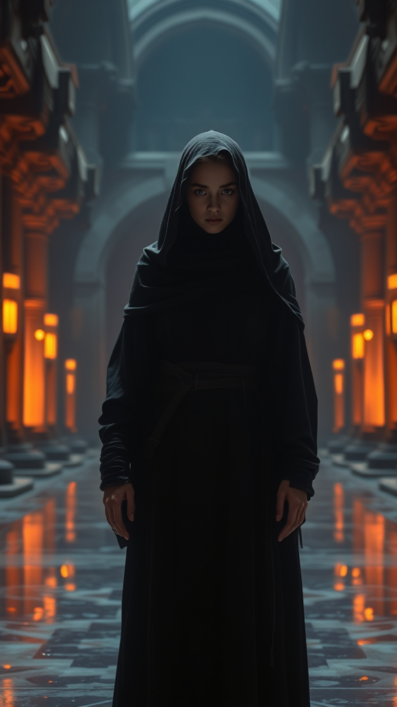 A young woman stands in the center of an ancient Star Wars temple, cloaked in dark, intricately detailed robes that flow around her like shadows. Her symmetrical, piercing eyes glimmer with intensity under the dramatic lighting that casts a half-rear, moody glow over her figure. The scene captures a hyperrealistic, cinematic aura, as if rendered with the most advanced physics-based ray tracing technology. Every element pops in sharp focus and high definition, showcasing insane and intricate details like a masterpiece captured through the 70mm lens of an elite photographer. The lighting is a masterful blend of natural and studio effects, with beautiful color grading accentuating every detail and creating an ambient volumetric atmosphere. The shadows are rich and rough, shimmering with the realism of screen space global illumination and optical fiber reflections. The full-body shot conveys a sense of both power and loneliness, surrounded by the reflective surfaces and glowing optics of the temple. The depth of field is perfectly calibrated, showcasing a cinematic quality that's both immersive and grand, with an elegant play of light and contrast. The entire composition suggests the quiet strength and enigmatic presence of a Sith lord, rendered with such super resolution that each detail, from the subtle texture of the robes to the ambient reflections, sings in hyper-detailed harmony.