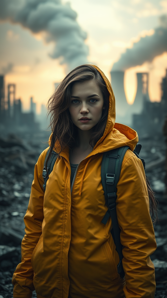 A young woman stands in the midst of a desolate, ruined cityscape with the silhouette of a nuclear power plant visible in the background. She gazes directly at the viewer, her expression calm yet alert. She wears a striking yellow jacket with the hood down, revealing wavy brown hair. Her sturdy hunting backpack hints at survival and adaptability in this post-apocalyptic world. The scene is illuminated by dramatic, volumetric lighting, reminiscent of a high-definition, cinematic photograph. The atmosphere is atmospheric and intense, capturing a moment frozen in time. The image captures subtle details, such as the texture of her clothing and the ambient light glinting off distant destroyed structures. Despite slight mutations visible in her elongated neck and additional fingers, her presence is strong and focused, symbolizing resilience. The artwork evokes the haunting beauty of decay and endurance, trending on platforms highlighting innovative digital art.