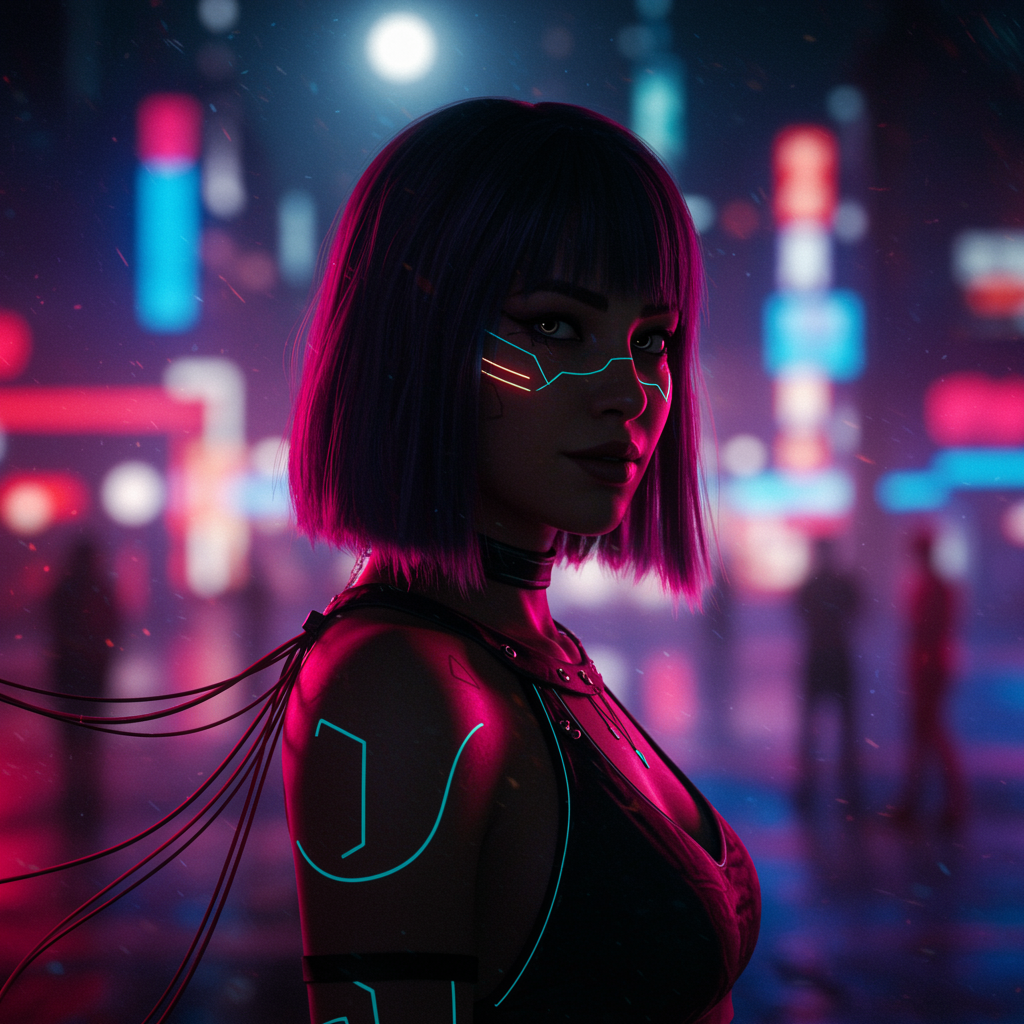 A young woman stands in the vibrant cityscape, illuminated by the electric glow of neon lights, casting vivid colors across her face. The moon hangs low in the sky, adding a celestial touch to the cyberpunk night. Her silhouette, partially obscured by shadows, reveals an air of mystery, accentuated by the complex detail in her attire. The depth of field blurs the bustling city in the background, drawing focus to her confident expression in this three-quarter view. Her attire, adorned with intricate strings, hints at a futuristic fashion sense, while the atmosphere buzzes with energy and the promise of hidden stories waiting to unfold.
