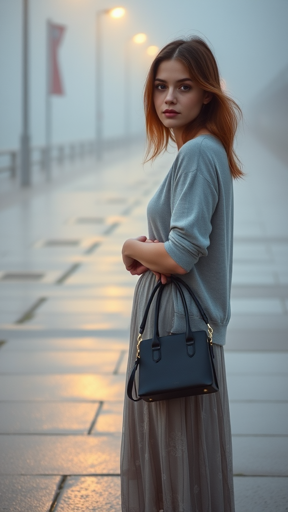 A young woman stands on a mist-laden pavement, clutching her handbag with delicate grace, captured in the dreamy style of Yigal Ozeri. The scene evokes the essence of beach portraits with soft, ethereal tones reminiscent of Michael Malm and Kaethe Butcher. Her expression is serene, as the gentle, muted colors envelop her in a tender embrace, suggestive of an intimate close-up. The atmosphere is tranquil, enveloped in a hazy ambiance that blurs the line between reality and dreamscape.
