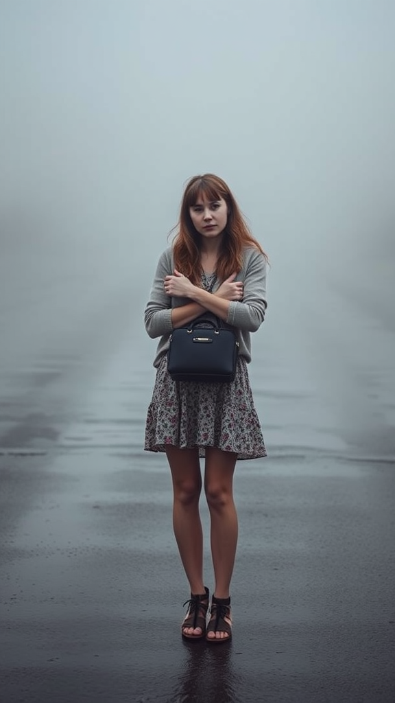 A young woman stands on a misty pavement, clutching her purse tightly, captured in the style of Yigal Ozeri. The scene echoes a beach portrait, reminiscent of Kaethe Butcher's intimate close-ups and Michael Malm's use of soft hues. The atmosphere is serene yet mysterious, the fog wrapping around her like a gentle veil, blending realism with a dreamlike quality that captivates the viewer's imagination.
