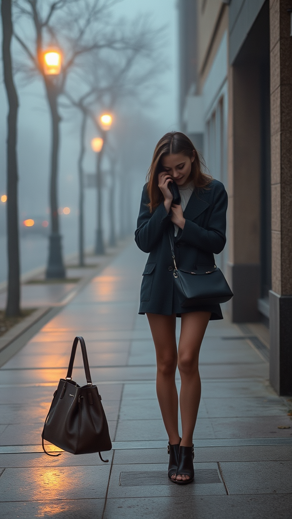A young woman stands on a misty sidewalk clutching her handbag, captured in a style reminiscent of Yigal Ozeri. The scene unfolds like a cinematic video, with elements of beach portraits interwoven, echoing the artistic essence of Kaethe Butcher. This close-up portrayal reveals soft, delicate hues, evoking the tranquil touch of Michael Malm's work. The atmosphere is one of serene fog and subtle elegance, blending high stylization with atmospheric depth.