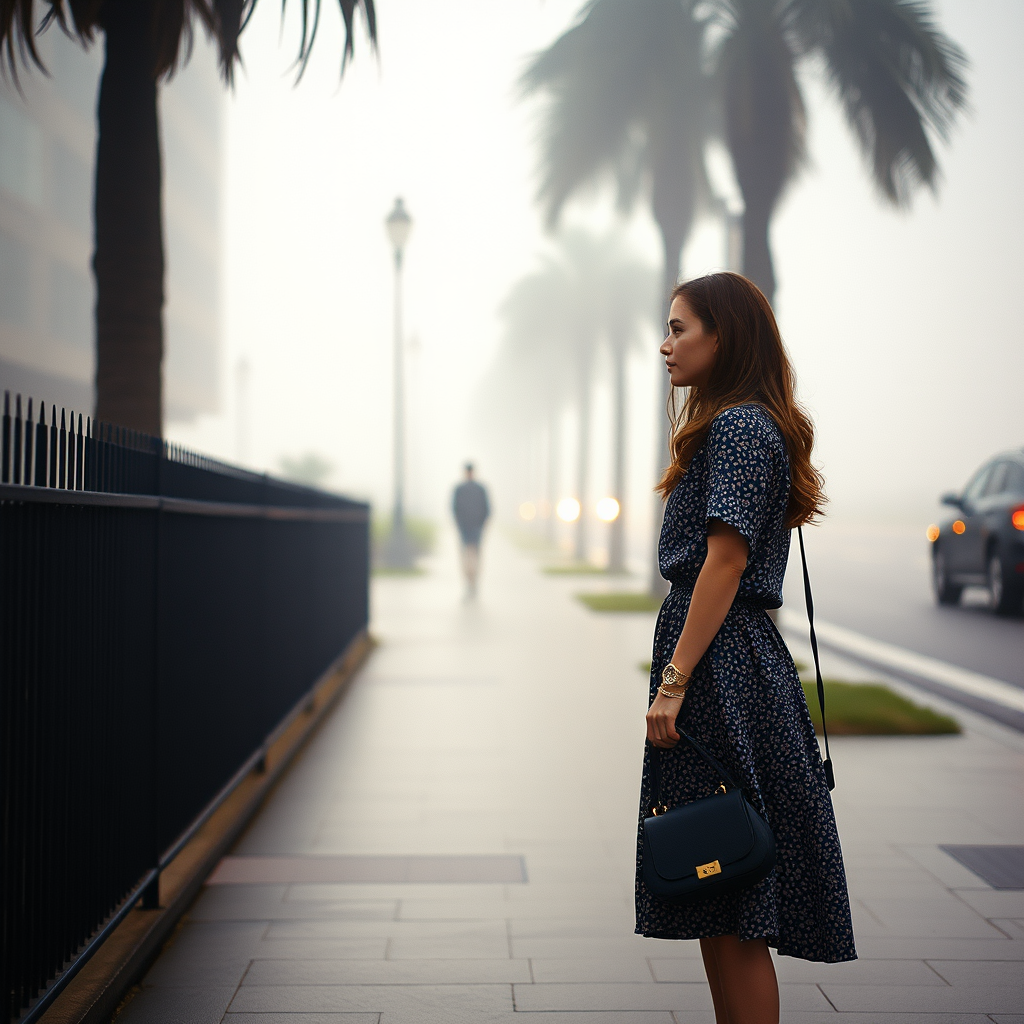 A young woman stands on a misty sidewalk, her purse gently clutched in hand, evoking the serene style of Yigal Ozeri. The scene unfolds like a beach portrait captured through a video lens, reminiscent of Kaethe Butcher's intimate approach. The focus tightens for a close-up, drawing on the soft hues characteristic of Michael Malm, blending atmospheric tones and a dreamlike quality into the composition.