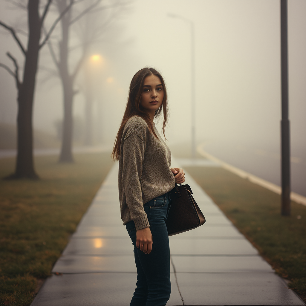 A young woman stands on a misty sidewalk, her purse gently clutched in one hand, reminiscent of a Yigal Ozeri painting, captured in a cinematic style akin to beachside portraits. The scene evokes the intimacy and detail of a Kaethe Butcher illustration, focusing on her serene expression in close-up, while the soft hues of a Michael Malm painting envelop the surroundings, blending seamlessly with the fog-draped landscape, creating a harmonious interplay of light and shadow.