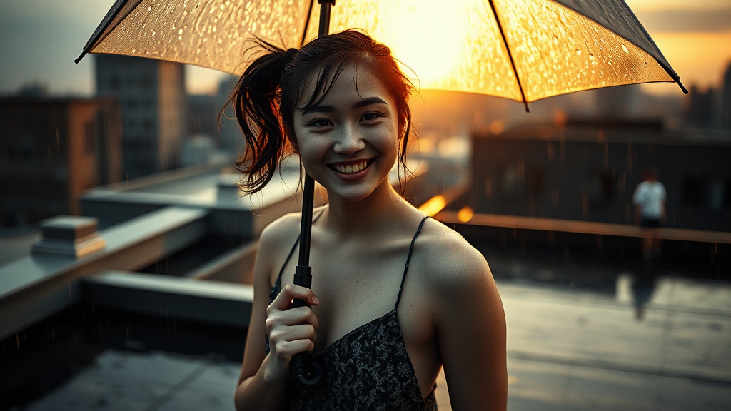 A young woman stands on a rainy rooftop, her full body in view. She smiles with wet hair styled in ponytails, her figure captured in dramatic golden hour light against a complex cinematic background. Soaking wet, she holds an umbrella, while the black and white tones add a timeless quality. The scene echoes with an artistic flair, capturing the essence of filmic storytelling, with rain droplets blurring some details for a dreamlike effect. Despite the rain, her spirit seems unbothered, embracing the moment with grace and strength.