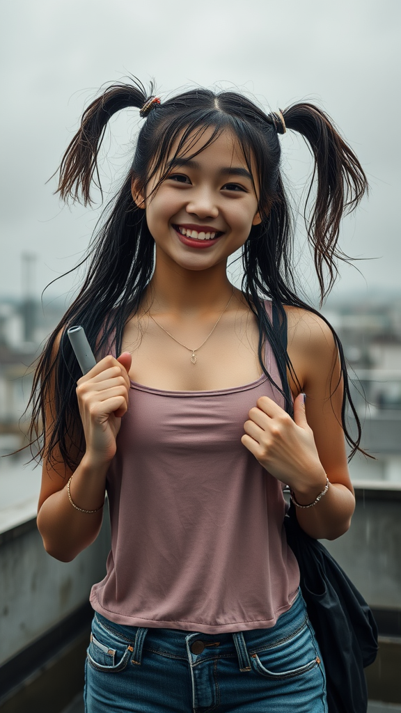 A young woman stands on a rooftop, drenched in rain, her wet hair glistening as it clings to her smiling face. Her hair is styled in playful ponytails, capturing the spirit of youthful exuberance. The rain cascades down, adding a natural sheen to her lively expression. She holds an umbrella that complements her joyful demeanor. The scene is captured in intimate detail, emphasizing her full body as she stands confidently against the gray sky. The image maintains a balanced composition, focusing on her vibrant presence and the dynamic weather, avoiding any distortions or exaggerated features. The mood is uplifting and authentic, celebrating the harmony between the elements and her spirited persona.