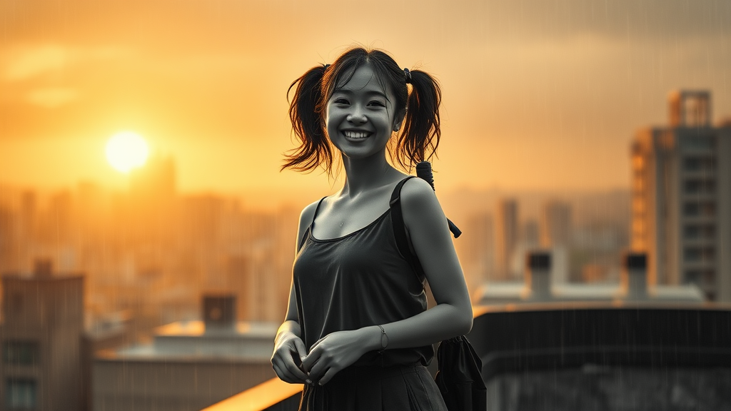 A young woman stands on a rooftop during a rainstorm, her whole body visible as she smiles with her wet hair styled in ponytails. The dramatic golden hour casts a cinematic glow over the complex background, enhancing the filmic atmosphere. She is soaked, a detailed scene capturing every drop of rain around her. An umbrella is tucked under her arm, its presence a stark contrast in this black and white setting. Despite the rain, she exudes joy and confidence, embodying the essence of youth and freedom. The image captures the motion, the blurriness of rain, but remains focused on her expressive face. Her hands have a natural elegance, her form is graceful, and her proportions are realistic and harmonious, perfectly drawn to reflect her poised presence amidst the chaotic weather. The scene is vibrant despite the monochrome palette, emphasizing the beauty of the moment without embellishments of color or additional elements.