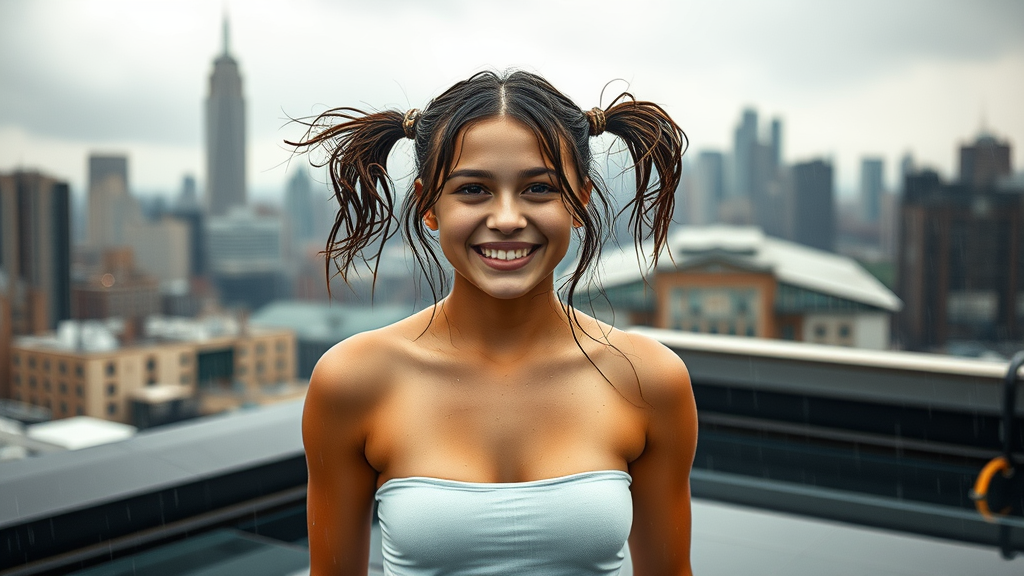 A young woman stands on a rooftop, her full body drenched from the rain, with water droplets clinging to her smiling face. Her wet hair is styled into playful ponytails that sway slightly in the breeze. She exudes a joyful energy despite the overcast sky. The scene captures her vibrant spirit, emphasizing the smooth texture of her skin and the sparkle in her eyes. Her pose is natural and relaxed, with her arms casually resting at her sides. The muted colors of the city skyline in the background contrast with her vivaciousness, while the overcast sky reflects in shards of glass on the rooftop around her feet. Everything is sharply defined, highlighting the crisp raindrops and the sheen on her hair, creating an atmosphere that’s lively yet serene.