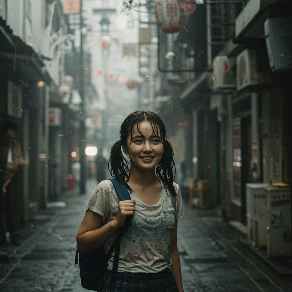 A young woman stands on the street, her face brightened by a smile, with damp hair pulled back into ponytails and a backpack slung over her shoulder. The scene unfolds in an epic realistic style, capturing the intricate, faded quality of her surroundings, filled with complex and detailed elements. The atmosphere is rendered with neutral tones and a hint of warmth from dramatic lighting, creating a cinematic feel. Despite the realistic environment, there are subtle distortions in the scene: unusual proportions, elements that seem slightly out of place, and blurred lines suggest a dreamlike quality. This artistic vision, reminiscent of hyper-detailed works on ArtStation, utilizes chiaroscuro to emphasize depth and intricacy, accentuating a vignette effect. Yet, among the beauty, there are touches of imperfection—a nod to the surreal—with amorphous shapes, absent details, and ethereal textures blending reality with imagination.
